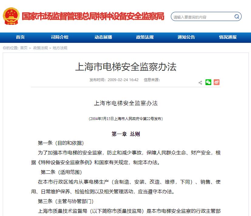 上海市質(zhì)量技術(shù)監(jiān)督局(以下簡稱市質(zhì)量技監(jiān)局)是本市電梯安全監(jiān)察的行政主管部門。區(qū)(縣)質(zhì)量技術(shù)監(jiān)督局(以下簡稱區(qū)(縣)質(zhì)量技監(jiān)局)負責本行政區(qū)域內(nèi)電梯的安全監(jiān)察工作。