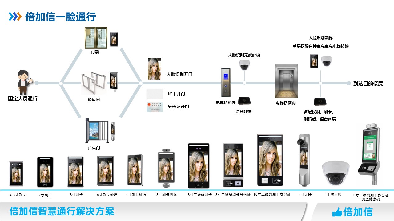 倍加信一臉通行解決方案 人臉識(shí)別授權(quán)一次,通行門禁、通道閘、梯控等系統(tǒng)