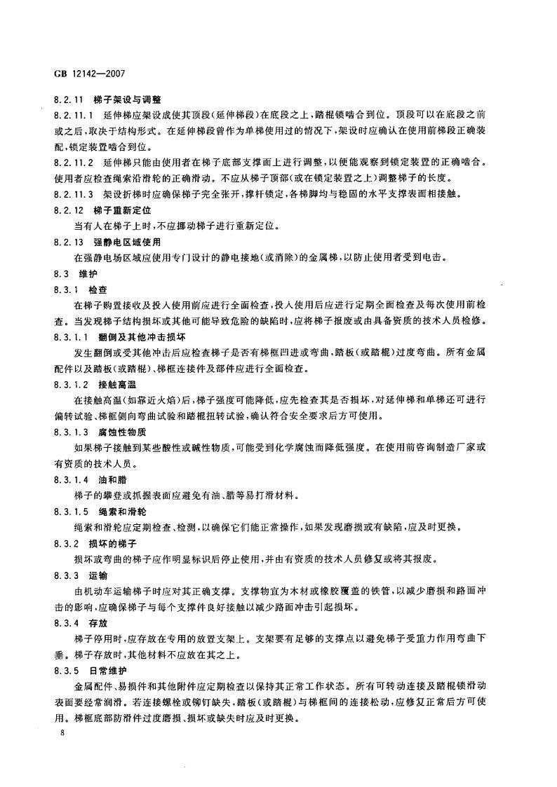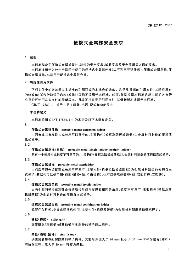 《便攜式金屬梯安全要求 GB 12142-2007》國家質量監(jiān)督檢驗檢疫總局、國家標準化管理委員會