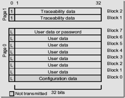 頁(yè)0有8個(gè)塊,每個(gè)塊有33位,第一位為鎖定位,當(dāng)?shù)谝晃粚懭霝?,該塊后面的32位就無(wú)法修改了。頁(yè)0塊0為配置字,決定了卡片跟閱讀器通信時(shí)工作的頻率,調(diào)制方式及卡片頁(yè)0塊號(hào)可見(jiàn)數(shù)目等。配置字很關(guān)鍵,同樣的T5557卡片,有些閱讀器能讀,有些閱讀器不能讀的,這個(gè)閱讀器內(nèi)部單片機(jī)的具體程序設(shè)計(jì)相關(guān),所以一旦設(shè)置好不要輕易修改。